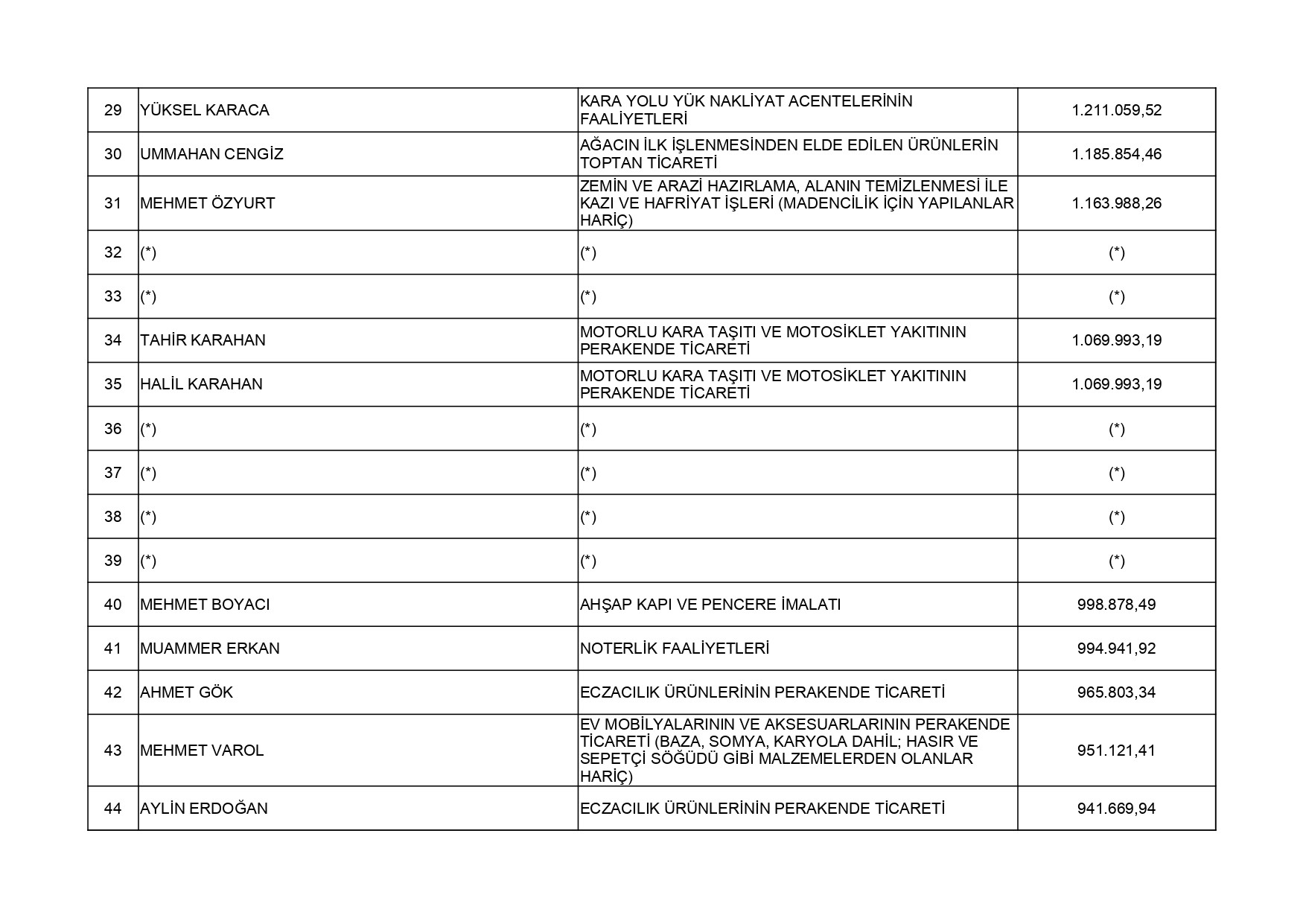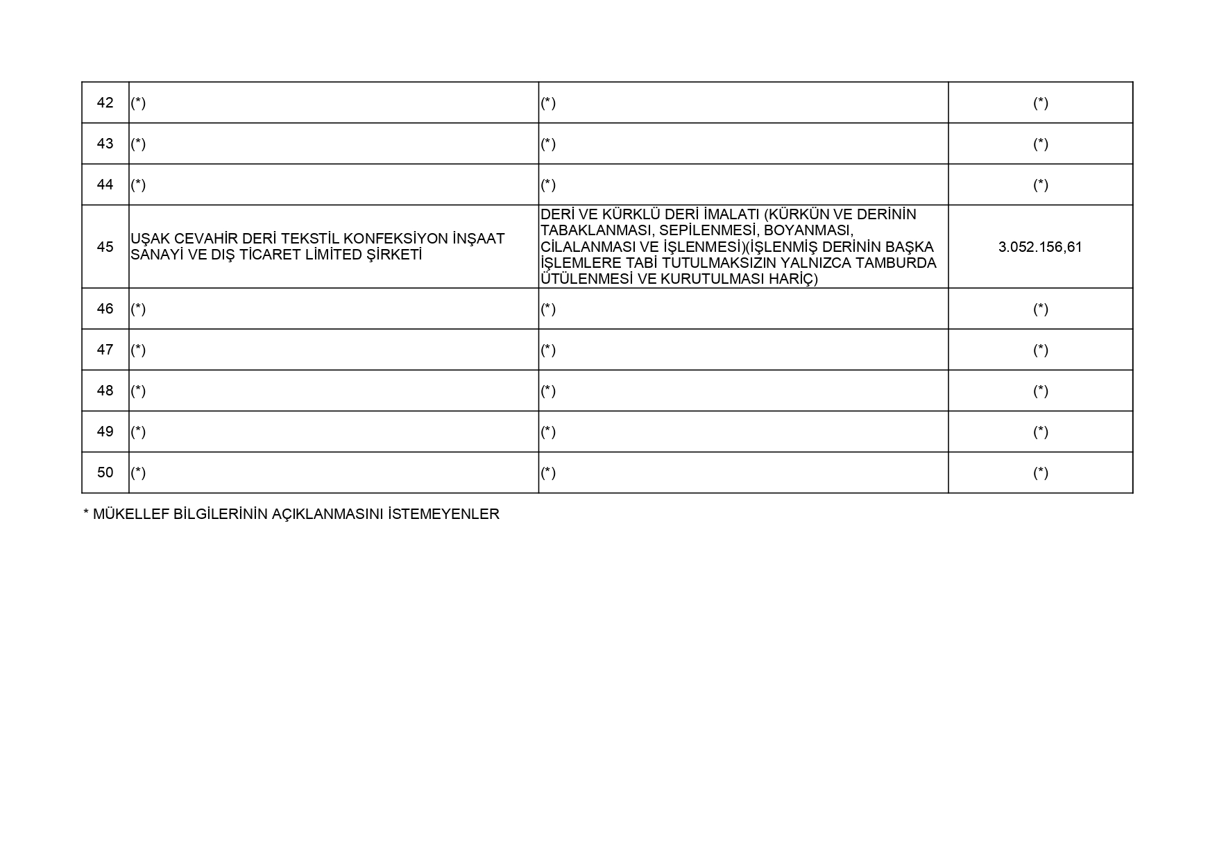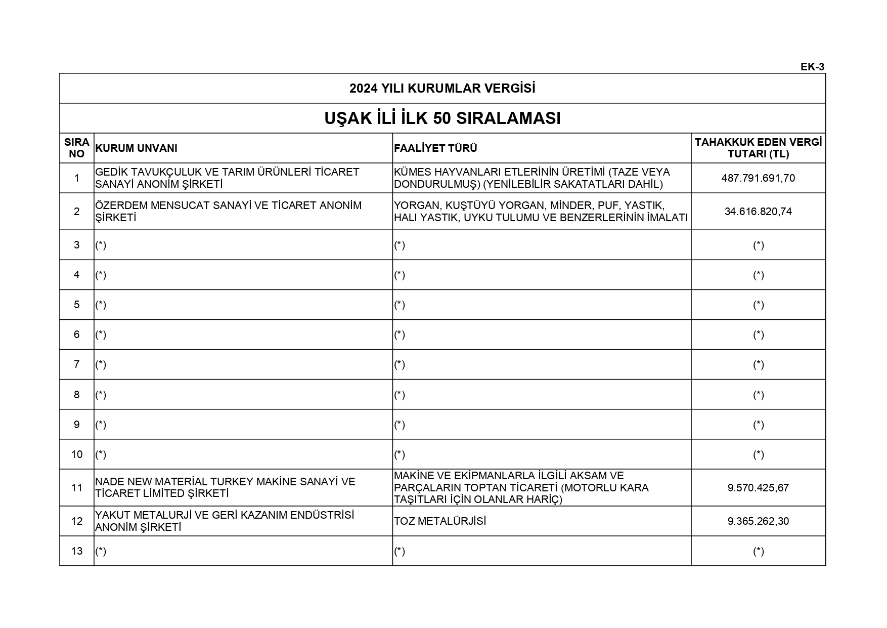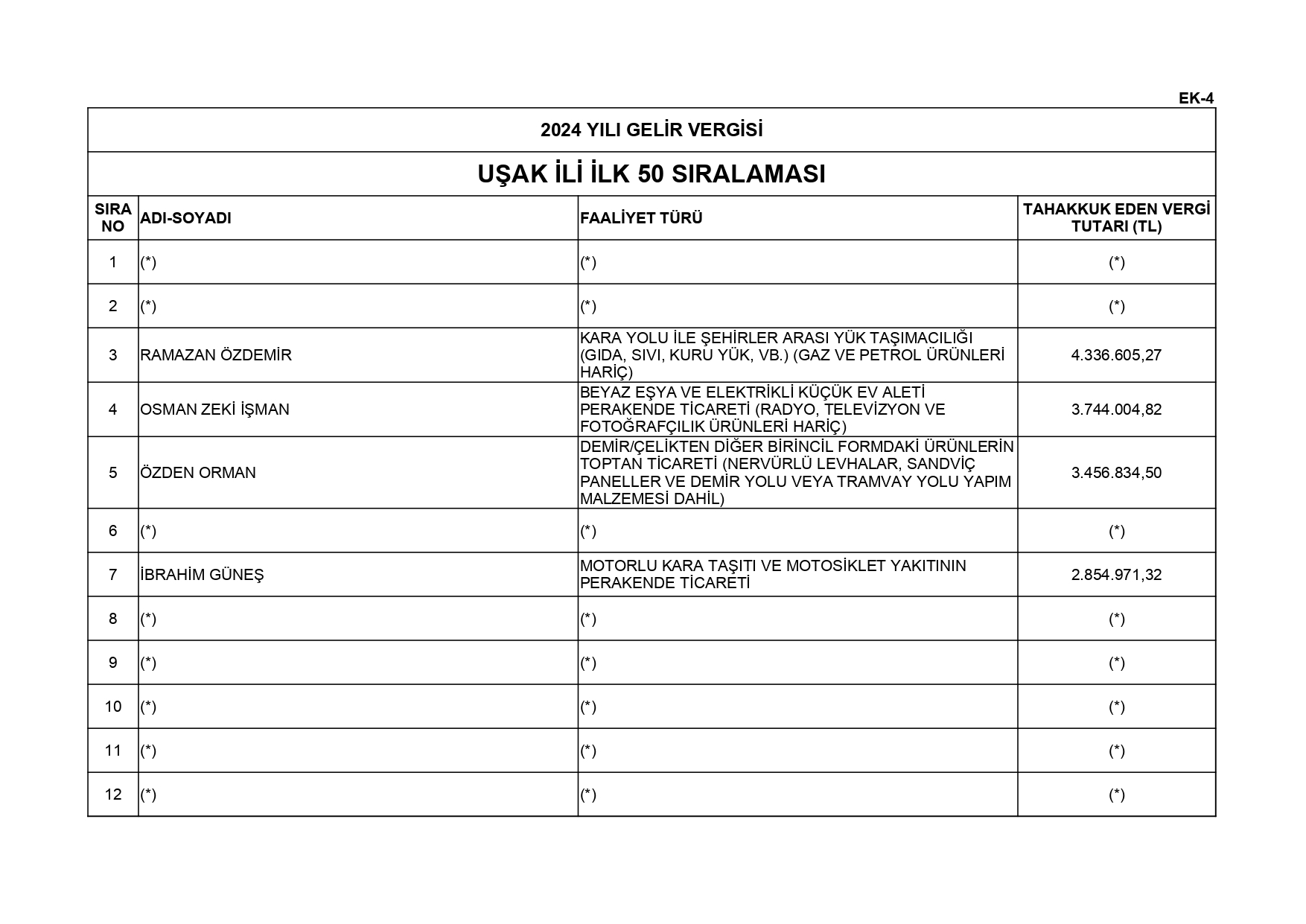213 Sayılı Vergi Usul Kanununun 5 inci maddesi ve 561 Sıra No'lu Vergi Usul Kanunu Genel Tebliği uyarınca; 2024 yılı vergilendirme dönemine ilişkin yıllık Gelir Vergisi ve Kurumlar Vergisi beyannamelerinin değerlendirilmesi sonucunda Uşak İli genelinde en fazla vergi beyan eden 50 mükellef listesi açıklandı. Gelir Vergisi:En fazla vergi beyan eden mükellef listesi