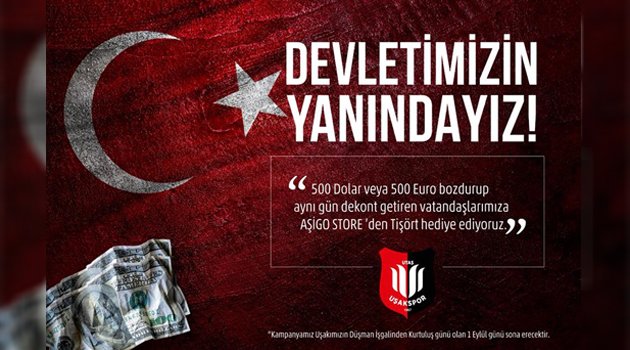 Bu bağlamda, Utaş Uşakspor ailesi olarak, ekonomik saldırı altındaki devletimize, vatanımıza bağlılığımızı ve desteğimizi göstermek adına 500 dolar veya 500 euro bozdurup, dekontunu Aşigo Store'ye getiren vatandaşlarımıza Şanlı Uşaksporumuzun tişörtünü hediye etme kararı aldık.