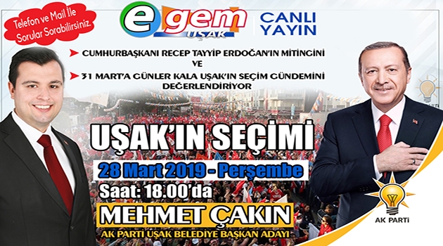 AK Parti Belediye Başkan Adayı Mehmet Çakın Egem Tv'de canlı olarak yayınlanacak Uşak'ın Seçimi Programına Katılacak. Cumhurbaşkanı Recep Tayyip Erdoğan'ın Uşak mitingi, seçim çalışmaları ve 31 Mart'a günler kala Uşak'ın seçim gündeminin değerlendirileceği Uşak'ın Seçimi Programı saat 18:00'da Egem Tv ekranlarında olacak.