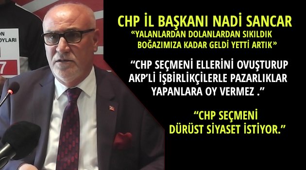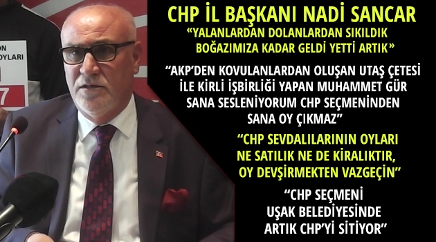OY DEVŞİRMEKTEN VAZGEÇİN diyerek İYİ Partilileri uyardı.. İYİ Parti Belediye Başkan Adayı Muhammet GÜR'ün önce aklanması gerektiğine vurgu yaparak “AKP’DEN KOVULANLARDAN OLUŞAN UTAŞ ÇETESİ İLE KİRLİ İŞBİRLİĞİ YAPAN MUHAMMET GÜR SANA SESLENİYORUM CHP SEÇMENİNDEN SANA OY ÇIKMAZ” DEDİ..İttifak konusuna da açıklık getiren CHP İl Başkanı Nadi Sancar “BİZ İTTİFAK YAPTIK CHP’LİLER BİZE OY VERECEK DİYEN İYİ PARTİLİLER CHP ÜZERİNDEN KURBAN KESMEYİ BIRAKIN. HAYAL GÖRMEKTEN VAZGEÇİN..CHP UŞAK’TA AK PARTİYİ YIKACAK TEK PARTİDİR."“CHP İLE AKPARTİ ARASINDA EN SON SEÇİMDE 8-9 BİN OY FARKI VAR İYİ PARTİ İLE AK PARTİ ARASINDA 30 BİN OY FARKI VAR BİRAZ SAMİMİ VE VİCDANLI DAVRANIN DÜRÜST OLUN” DEDİ..