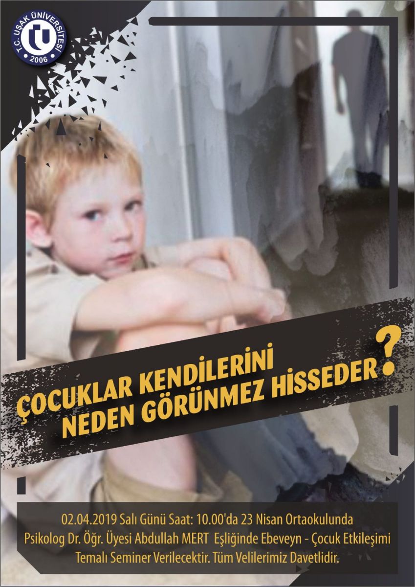 Uşak Üniversitesi öğrencilerinden bir proje daha Uşak Üniversitesi Halkla İlişkiler Ve Reklamcılık 4.Sınıf öğrencileri Esra Önder Abdulmalik Gündeş ve Fatoumato Diarra öğrencilerin okul hayatında ve normal hayatlarında kendilerini daha iyi ifade edebilmesi ve öğrencilerin ergenlik çağına girmeleri ile daha fazla ilgi görmek istemeleri ve bu ilginin öğrencilerin ailesi ve arkadaşları tarafından karşılanmaması durumunda ortaya çıkacak problemleri psikolog ve okuldaki hocaları eşliğinde çözmek adına ÇOCUKLAR NEDEN KENDİLERİNİ GÖRÜNMEZ HİSSEDER adlı sosyal sorumluluk projesini geliştirdiler.Proje 23 Nisan Ortaokulunda 02.04.2019 Salı günü saat 10.00 da yapılacak konferans ile başlayacaktır. İkinci etkinlik olarak 03.04.2019 Çarşamba günü 5. Sınıf öğrencileri velilerine onların kendileriyle nasıl vakit geçirmek istediklerini ve diğer söyleyemedikleri şeyleri mektup olarak yazacaklardır. Üçüncü etkinlik olarak 04.04.2019 Perşembe günü saat 10:00 da 23 Nisan Ortaokulu bahçesinde öğrenci ve veliler birlikte resim çizecekler ve kitap okuyacaklardır. Yapılacak olan kampanyamıza 23 Nisan ortaokulu 5. Sınıf velilerimiz davetlidir.
