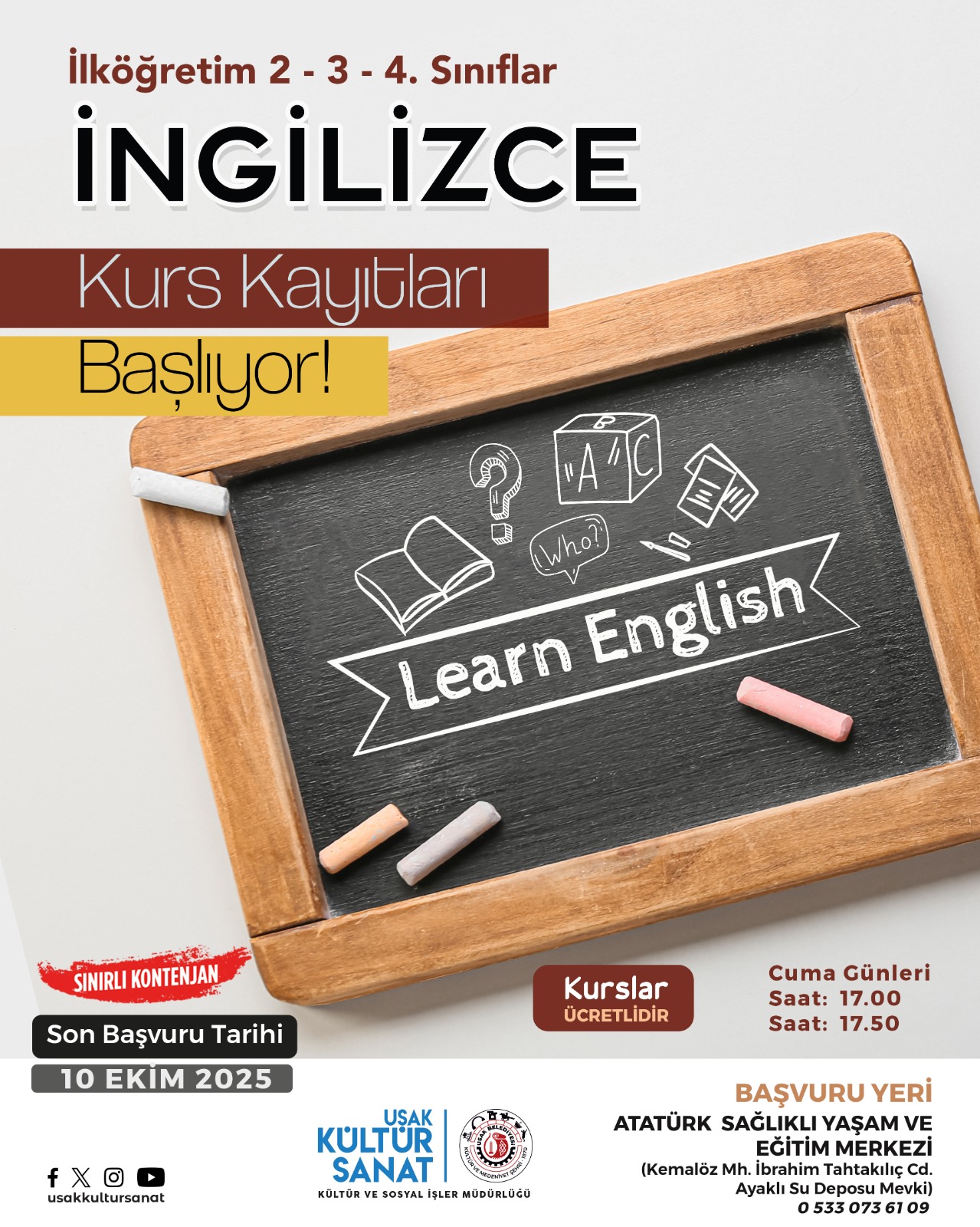 Aynı yaş grubundaki öğrenciler için düzenlenecek İngilizce kursu, çocukların eğlenerek yabancı dil öğrenmesini amaçlıyor. Kurs her Cuma günü Atatürk Sağlıklı Yaşam ve Eğitim Merkezi’nde gerçekleştirilecek. Başvurular yine 10 Ekim Cuma gününe kadar bizzat yapılabilecek.