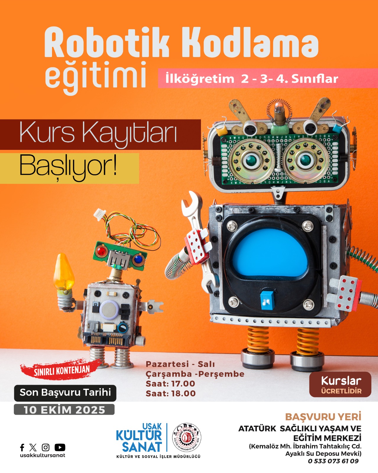 İlköğretim 2, 3 ve 4. sınıf öğrencilerine yönelik olarak düzenlenecek robotik kodlama eğitimi, çocuklara bilimin ışığında teknolojiyle tanışma ve üretkenliklerini geliştirme imkânı sağlayacak. Eğitimler Atatürk Sağlıklı Yaşam ve Eğitim Merkezi’nde Pazartesi, Salı, Çarşamba ve Perşembe günleri yapılacak. Kayıt için son başvuru tarihi ise 10 Ekim Cuma olarak belirlendi.