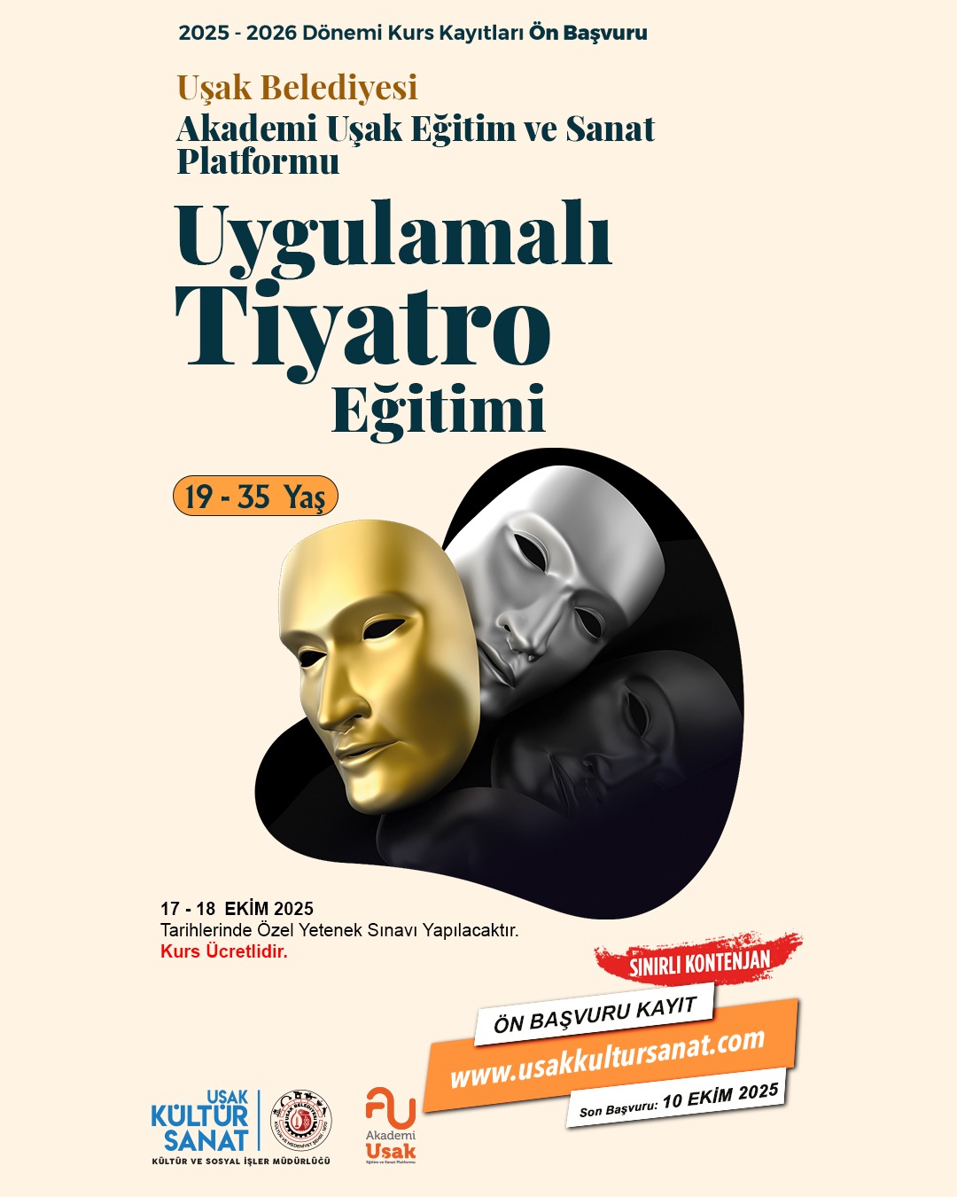 19-35 yaş aralığındaki katılımcılar için açılacak uygulamalı tiyatro eğitimi ise özel yetenek sınavıyla öğrenci kabul edecek. Kontenjanla sınırlı kursa başvurular yine www.usakkultursanat.com üzerinden 10 Ekim’e kadar yapılabilecek. Eğitimlerde katılımcılar, Akademi Uşak Eğitim ve Sanat Platformu’nun deneyimli hocaları eşliğinde sahne deneyimi kazanma fırsatı bulacak.
