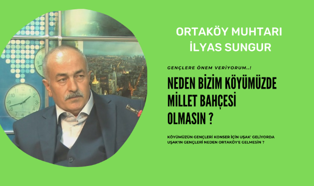 Daha ağaçlandırılmamış park olarak dizayn edilmilş ama faaliyete geçmemiş olan bir alanımız var. Burada Kütüphane, çay ocağı gibi alanlar yaptık. Hafta sonları canlı müzik hatta konserler düzenlemeyi düşünüyoruz. Neden Ortaköy gençleri uşak’a gidiyorlarda Uşak’ın gençleri ortaköy’e gelmesin dedik. Cumhurbaşkanımızın 81 ile milletbahçesi sözünden yola çıkarak neden bizim köyümüzde Millet bahçesi olmasın dedik ve çalışmalarda son aşamaya geldik..!