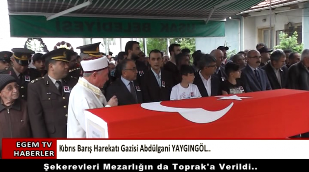 Kıbrıs gazisi Abdülgani Yaygıngöl hakkın rahmetine kavuştu.78 yaşında olan Kıbrıs gazisi Abdülgani Yaygıngöl bir süredir rahatsızlığı nedeniyle tedavi görüyordu.Gazi Abdülgani Yaygıngölün cenazesine Vali yardımcısı Sait Topoğlu,il jandarma Alay Komutanı Jandarma Albay Nedim Selbisu ile yakınları ve dostları katıldı.Gazi Abdülgani Yaygıngöl,İl Müftüsü Eyüp Baldemir tarafından kıldırılan cenaze namazından sonra Şeker evleri mezarlığında toprak'a verildi.Egem Tv ailesi olarak Hakkın rahmetine kavuşan Gazimiz Abdülgani Yaygıngöl'e Allahtan rahmet diliyoruz.Kederli ailesi ve yakınlarına baş sağlığı diliyoruz.Allah Rahmet Eylesin.
