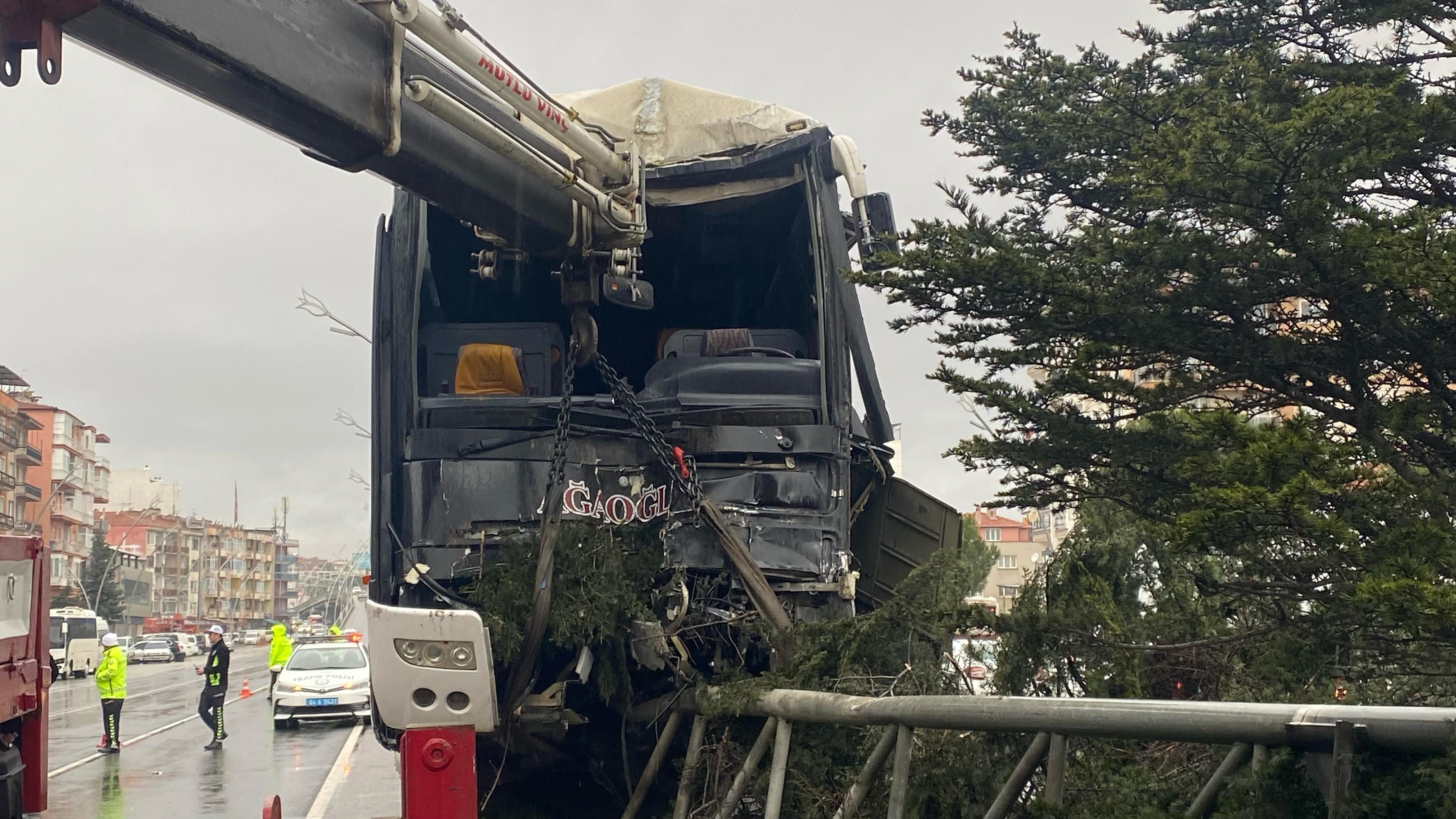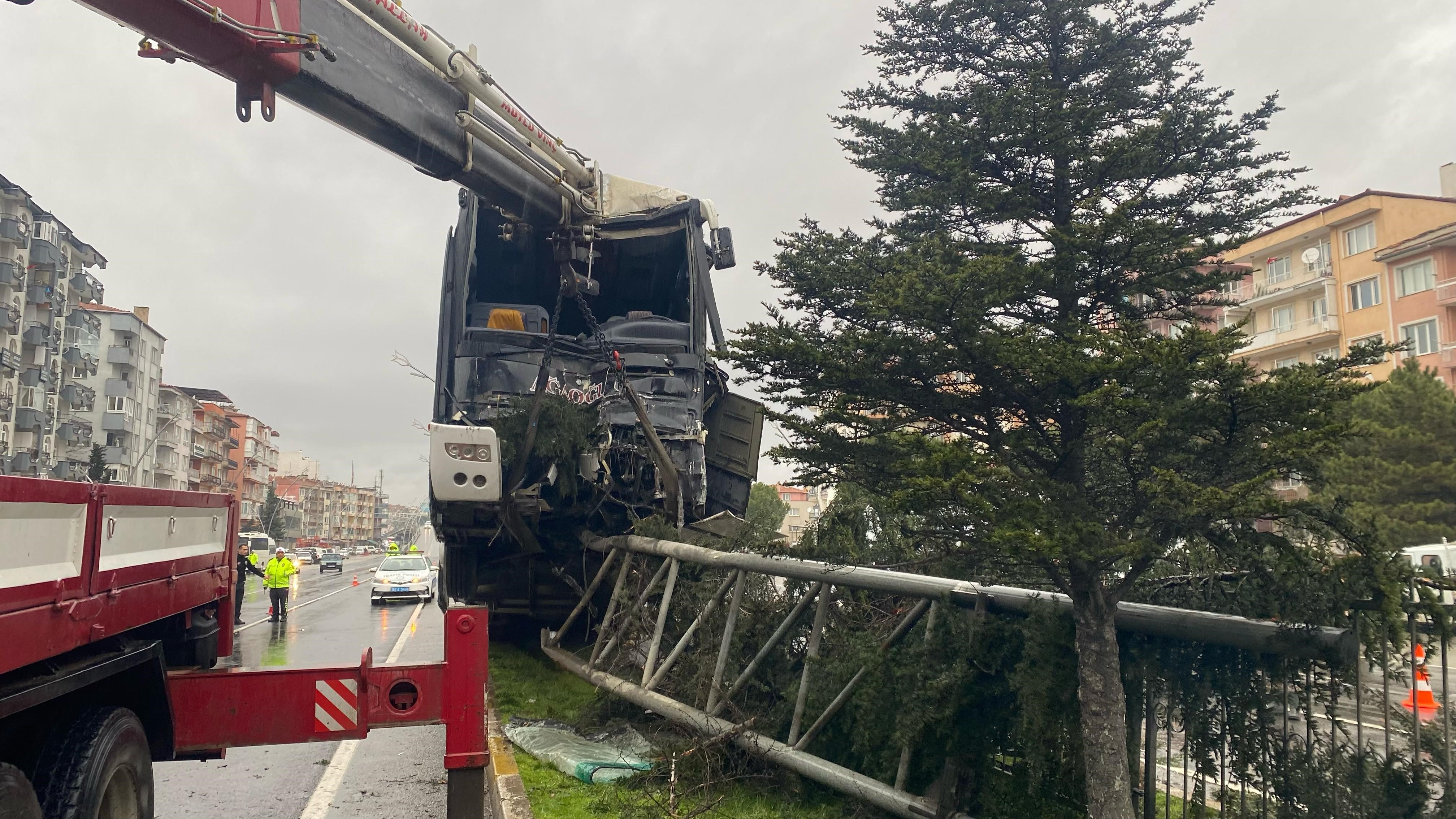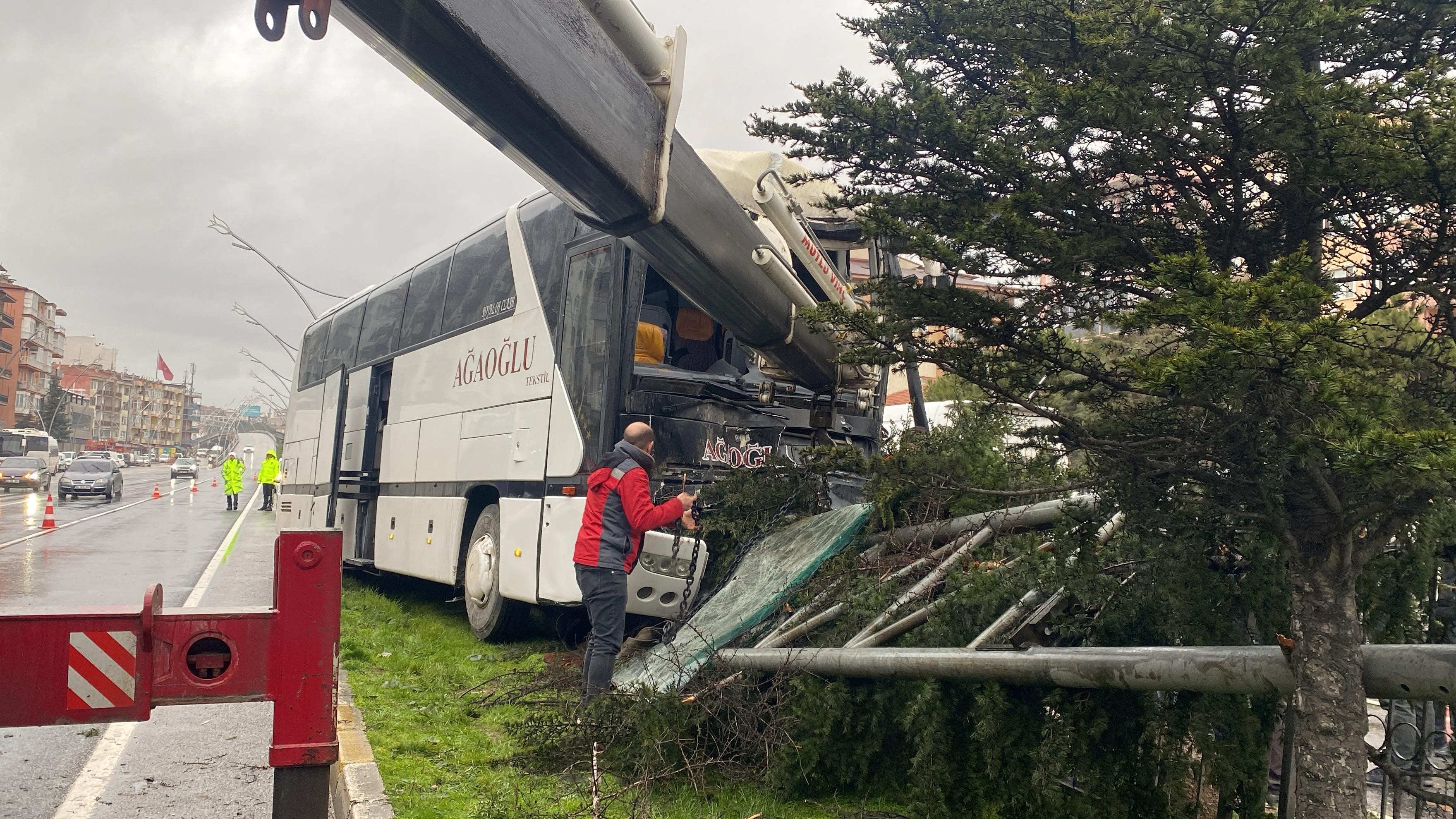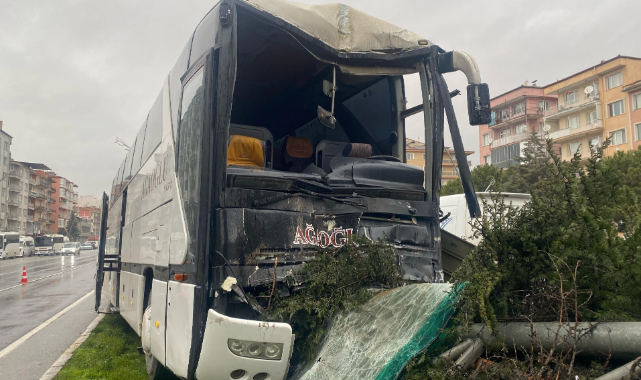 Uşak’ta kontrolden çıkan servis otobüsü önce kamyon ve otomobile, sonrasında ise aydınlatma direği ile ağaca çarparak durabildi.