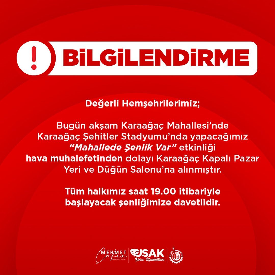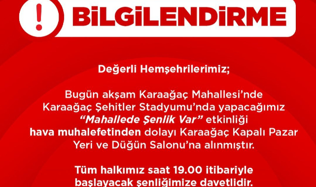 Her akşam farklı bir mahallede çocuklarımız ve ailelerimizle buluşarak yaza renk kattığımız "Mahallede Şenlik Var" etkinlikleri, bu akşam saat 19.00'da Karaağaç Mahallesi'nde hava muhalefetinden dolayı Karaağaç Kapalı Pazar Yeri ve Düğün Salonu'nda yapılacaktır.