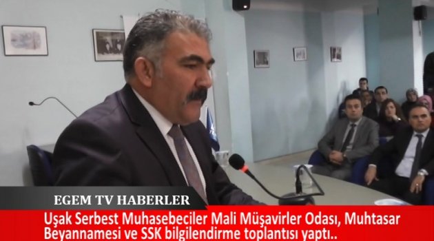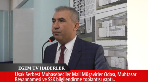 Serbest Muhasebeciler Mali Müşavirler Odası toplantı salonunda Muhtasar Beyannamesi ve SSK bilgilendirme toplantısı yapıldı. Yapılan toplantıda Kırşehir Muhasebeciler Odası Başkanı Özgür Albayrak konuşmacı olarak katıldı. Düzenlenen programda bir konuşma yapan Uşak Serbest Muhasebeciler Mali Müşavirler Odası Yönetim Kurulu Başkanı Uğur Albayrak programa katılım sağlayan herkese teşekkür etti.