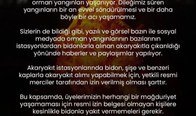 Yazılı ve görsel basının yanı sıra sosyal medyada yer alan paylaşımlarda, orman yangınlarının bir kısmının bidonlarla taşınan akaryakıtla çıkarıldığı öne sürülüyor. Bu iddiaların ardından PÜİS, üyelerini uyardı ve resmi izin belgesi olmayan kişilere kesinlikle bidonla akaryakıt verilmemesi gerektiğini belirtti.Açıklamada, akaryakıt istasyonlarında bidon, şişe ve benzeri kaplarla yakıt alımı yapılabilmesi için yetkili resmi merciler tarafından izin verilmiş olmasının zorunlu olduğu vurgulandı. PÜİS, herhangi bir mağduriyet yaşanmaması adına tüm üyelerinin bu kurala uymasını istedi.PÜİS Genel Merkezi tarafından yapılan açıklamada, “Üyelerimizin resmi izin belgesi olmayan kişilere kesinlikle bidonla yakıt vermemeleri gerekir” denilerek konuya dair hassasiyet çağrısında bulunuldu.