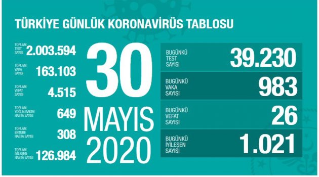 Sağlık Bakanı Fahrettin Koca 30 Mayıs 2020 tarihi itibariyle Korona virüs ile ilgili son durumu paylaştı. Türkiye'de son 24 saatte koronavirüsten 26 kişi daha hayatını kaybetti, 1.021kişi daha hastalığı yendi. Türkiye'de koronavirüsten can kaybı 4.515'e, toplam vaka sayısı 163 Bin 103'e yükseldi.Sağlık Bakanı Fahrettin Koca yaptığı açıklamada "Toplam test sayımız 2 milyonu geçti. Düne göre günlük test sayımız 3.000 arttı. Yeni vaka sayımız 1.000’in altında. Gelecek günler, el hijyenine özene; maske ve sosyal mesafe kuralının ikisine birlikte uymamıza bağlı. DAHA SIKI TEDBİR, DAHA İYİ SONUÇTUR." dedi.
