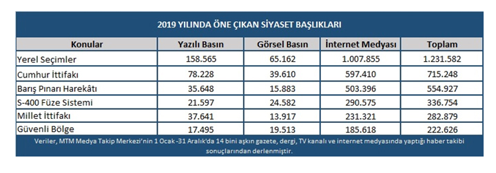 2019 yılında Türkiye siyasetinde önemli gelişmeler yaşandı. Yılın en önemli gelişmelerinden biri, Türkiye’nin sandık başına giderek 5 yıl boyunca görev yapacak yerel yöneticileri seçmesi oldu. Diğer bir önemli gelişme ise Türkiye'nin güney sınırında oluşturulmaya çalışılan terör koridorunu yok etmek, bölgeye barış ve huzur getirmek amacıyla başlatılan Barış Pınarı Harekâtıydı.2019 yılında medyada en çok Yerel Seçimler konuşuldu57 milyon seçmene sahip Türkiye, 5 yıl boyunca görev yapacak yerel yöneticileri seçmek için 31 Mart’ta sandığa gitti. CHP, İstanbul, İzmir ve Ankara ve Antalya gibi önemli şehirleri kazanırken, AKP Türkiye genelindeki liderliğini sürdürdü. Cumhur İttifakı’nın seçimlere itiraz etmesi nedeniyle Yüksek Seçim Kurulu, bazı İl ve İlçelerde geçersiz oyların yeniden sayılmasına karar verdi. Seçim sayımının tekrarlanmasının ardından, İstanbul Büyük Şehir Belediye Başkanı seçilen Ekrem İmamoğlu, 17. günün sonunda İl Seçim Kurulu’ndan mazbatasını aldı.Ak Parti, İstanbul'da gerçekleşen seçimin iptali için Yüksek Seçim Kurulu’na olağanüstü itiraz başvurusunda bulundu. Yüksek Seçim Kurulu, Sadi Güven başkanlığında toplanarak İstanbul Büyükşehir Belediye Başkanlığı seçimini, 4'e karşı 7 üyenin aldığı karar ile iptal etti ve seçiminin 23 Haziran 2019’da tekrarlanmasına karar verdi. Karar sonucu, Ekrem İmamoğlu’nun 17 Nisan’da aldığı mazbata hükümsüz hale geldi.31 Mart’ta yapılan seçimlerin bazı ilçe ve beldelerde de iptaline karar verilmesinin ardından, Artvin’in Yusufeli, Kırıkkale’nin Keskin, Denizli’nin Honaz ilçeleri ve Adıyaman’ın Besni ilçesine bağlı olan Kesmetepe beldesinde vatandaşlar yeniden sandık başına gitti.İstanbul ise yeni Belediye Başkanı’nı seçmek için 23 Haziran’da tekrar sandık başındaydı. Seçimde, Millet İttifakı adayı CHP'li Ekrem İmamoğlu, Cumhur İttifakı adayı AK Parti'li Binali Yıldırım, Saadet Partisi adayı Necdet Gökçınar ve Vatan Partisi adayı Mustafa İlker Yücel yarıştı. YSK Başkanı Sadi Güven’in açıklamış olduğu seçim sonuçlarına göre, Ekrem İmamoğlu yüzde 54,21, Binali Yıldırım yüzde 44,99 oy aldı. Bu sonuca göre İstanbul Büyükşehir Belediyesi'nin yeni Belediye Başkanı CHP'li Ekrem İmamoğlu oldu. İmamoğlu böylece 3 ay içinde ikinci kez mazbata almış oldu.Seçim öncesi ve sonrası medyada büyük ilgi gören Yerel Seçimler, Medya Takip Merkezi’nin raporuna göre yıl boyunca toplam 1 milyon 231 bin 528 habere yansıyarak 2019 yılının en çok konuşulan siyaset başlığı oldu.Barış Pınarı Harekâtı ilgi odağı olduTürkiye'nin güney sınırında oluşturulmaya çalışılan terör koridorunu yok etmek, bölgeye barış ve huzur getirmek amacıyla başlatılan Barış Pınarı Harekâtı, Cumhurbaşkanı Recep Tayyip Erdoğan’ın talimatı ile Türk Silahlı Kuvvetleri tarafından 9 Ekim saat 16.00’da başladı. Fırat Kalkanı Harekâtı ve Zeytin Dalı Harekâtı’nda olduğu gibi, sadece teröristler ile bunlara ait barınak, sığınak, mevzii, silah, araç ve gereçler hedef alındı. Sivil/masum kişilerin ve harekât bölgesindeki tarihi, kültürel, dini yapılar, altyapı tesisleri ile bölgede bulunması muhtemel dost ve müttefik ülke unsurlarının zarar görmemesi için her türlü dikkat ve hassasiyet gösterildi.9 Ekim'de başlayan Barış Pınarı Harekâtı kapsamında, yetkililerin açıklamasına göre 2 bin 200 kilometrekarelik alan teröristlerden arındırıldı ve toplam 160 yerleşim biriminde kontrolün sağlandı.Dünya çapında ilgi odağı haline gelen Barış Pınarı Harekâtı, MTM’nin medya raporuna göre yıl boyunca medyada toplam 554 bin 927 habere yansıyarak 2019 yılının en çok konuşulan siyaset başlıklarından biri oldu..jpg)