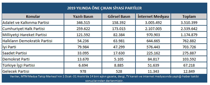 2019 yılında medyada en çok AK Parti’den bahsedildiMedya Takip Merkezi, 2019 yılını kapsayan araştırmasında siyasi partilerin medya yansımalarını da inceledi. Adalet ve Kalkınma Partisi (AKP) yıl boyunca toplam 3 milyon 510 bin 399 haberde bahsedilerek 2019 yılının en çok konuşulan siyasi partisi oldu. Ak Parti’yi 2 milyon 539 bin 642 haber ile Cumhuriyet Halk Partisi (CHP) takip ederken, medyada en çok bahsi geçen üçüncü parti ise 1 milyon 174 bin 879 haber ile Milliyetçi Hareket Partisi(MHP) oldu. Eski Başbakan Ahmet Davutoğlu'nun kurucuları arasında yer aldığı “Gelecek Partisi” ise Aralık ayında kurulmasına rağmen, medyada 12 bin 849 habere yansıdı.