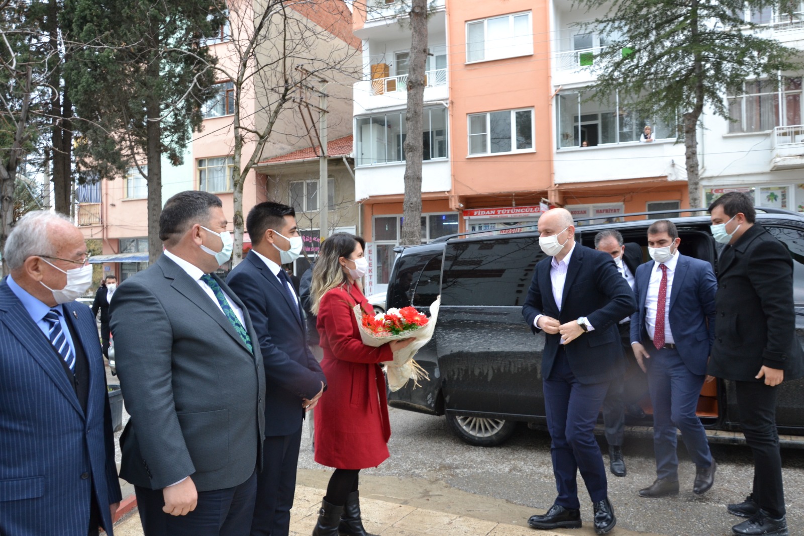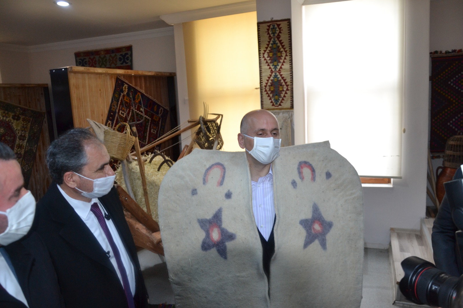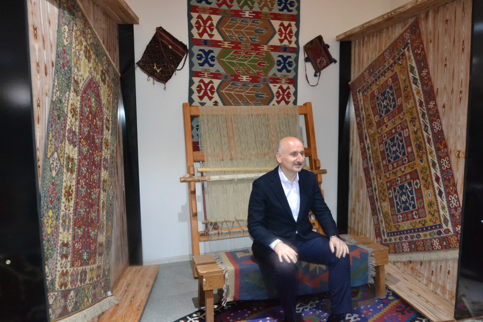Bakan Karaismailoglu'a önce kepenek giydirildi ardından Ulaştırma ve Alt yapı Bakanı na kilim tezgahina oturdu ardindan esme kilimi hediye edildi.