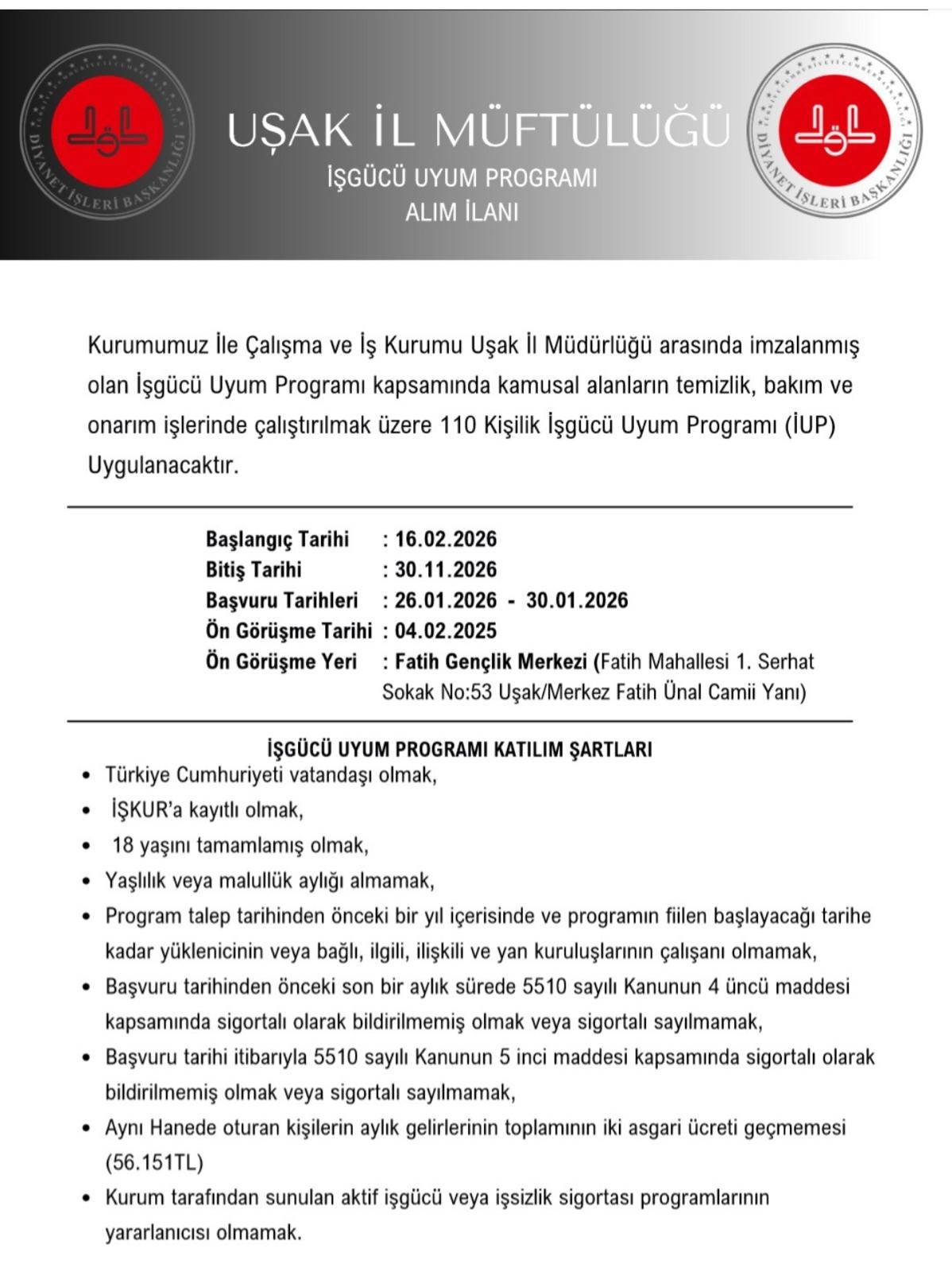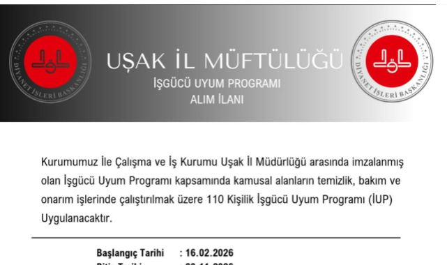 Uşak İl Müftülüğü ile Türkiye İş Kurumu (İŞKUR) Uşak İl Müdürlüğü arasında imzalanan protokol kapsamında, İşgücü Uyum Programı (İUP) çerçevesinde 110 kişilik personel alımı yapılacağı duyuruldu. Program kapsamında görevlendirilecek katılımcılar, kamusal alanların temizlik, bakım ve onarım işlerinde istihdam edilecek.