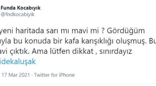 Uşak Valisi Funda Kocabıyık, resmi sosyal medya hesabından yaptığı paylaşımla, Uşak’ın sarı renk mi yoksa mavi renk mi olduğuna son noktayı koydu. Kocabıyık, yaptığı paylaşımla Uşak’ın sınırda olmasına karşın mavi renkli olduğunu açıkladı. Kocabıyık, “Uşak yeni haritada sarı mı mavi mi ? Gördüğüm kadarıyla bu konuda bir kafa karışıklığı oluşmuş. Bu kez de mavi çıktık. Ama lütfen dikkat , sınırdayız” açıklamasında bulundu. Film izle