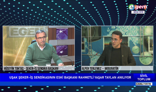 Sivil Toplum programına konuk olan Uşak Şeker-İş Sendikası Başkanı Hüseyin Toktaş, sendikanın eski başkanı Yaşar Taylan’ı andı. Uşak Şeker-İş Sendika Başkanı Hüseyin Toktaş ‘Rahmetli Yaşar Başkan 2013 yılında seçilmesiyle beraber ben de onun yanında onunla birlikte hareket ediyorduk. Daha sonra ki dönemlerin de kendisi beni temsilci olarak atadı. Rahmetli Başkanım çok aktif, girişken, tuttuğunu koparan bir kişiliğe sahipti. İş vereninden çarşı esnafına kadar iyi niyet içerisinde bilinen biriydi. Düzgün kişilikte bir insandı. Allah rahmet eylesin’ dedi. Bizler de Egem Tv Ailesi Olarak Uşak Şeker-İş Sendikası Eski Başkanı Rahmetli Yaşar Taylan’ı Rahmetle Anıyoruz.