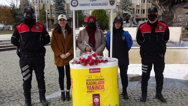 Uşak’ta 8 Mart Dünya Emekçi Kadınlar Günü dolayısıyla İl Emniyet Müdürlüğü ve İl Jandarma Komutanlığı ekipleri 15 Temmuz Şehitler Meydanı’na stant kurdu.
