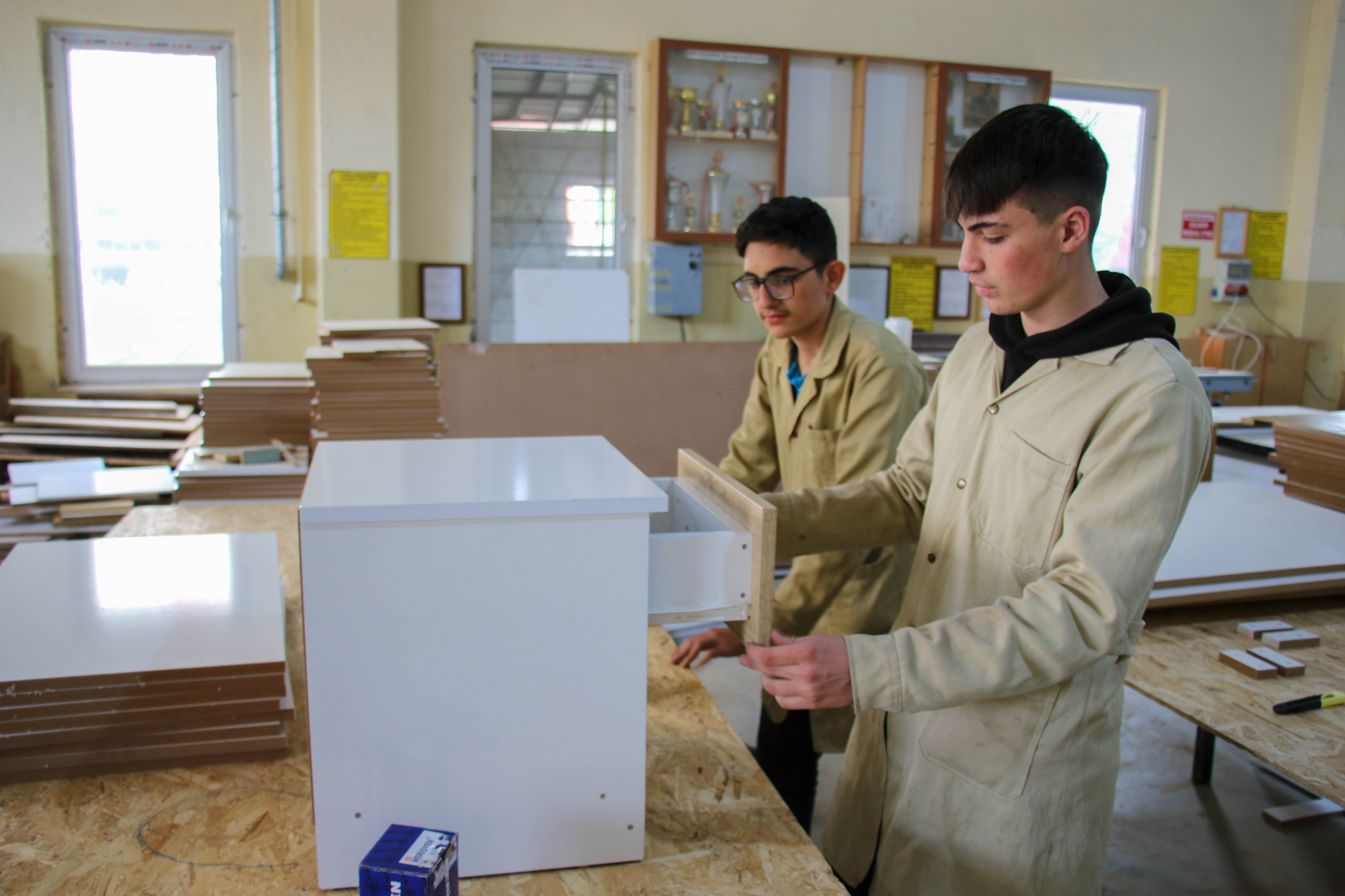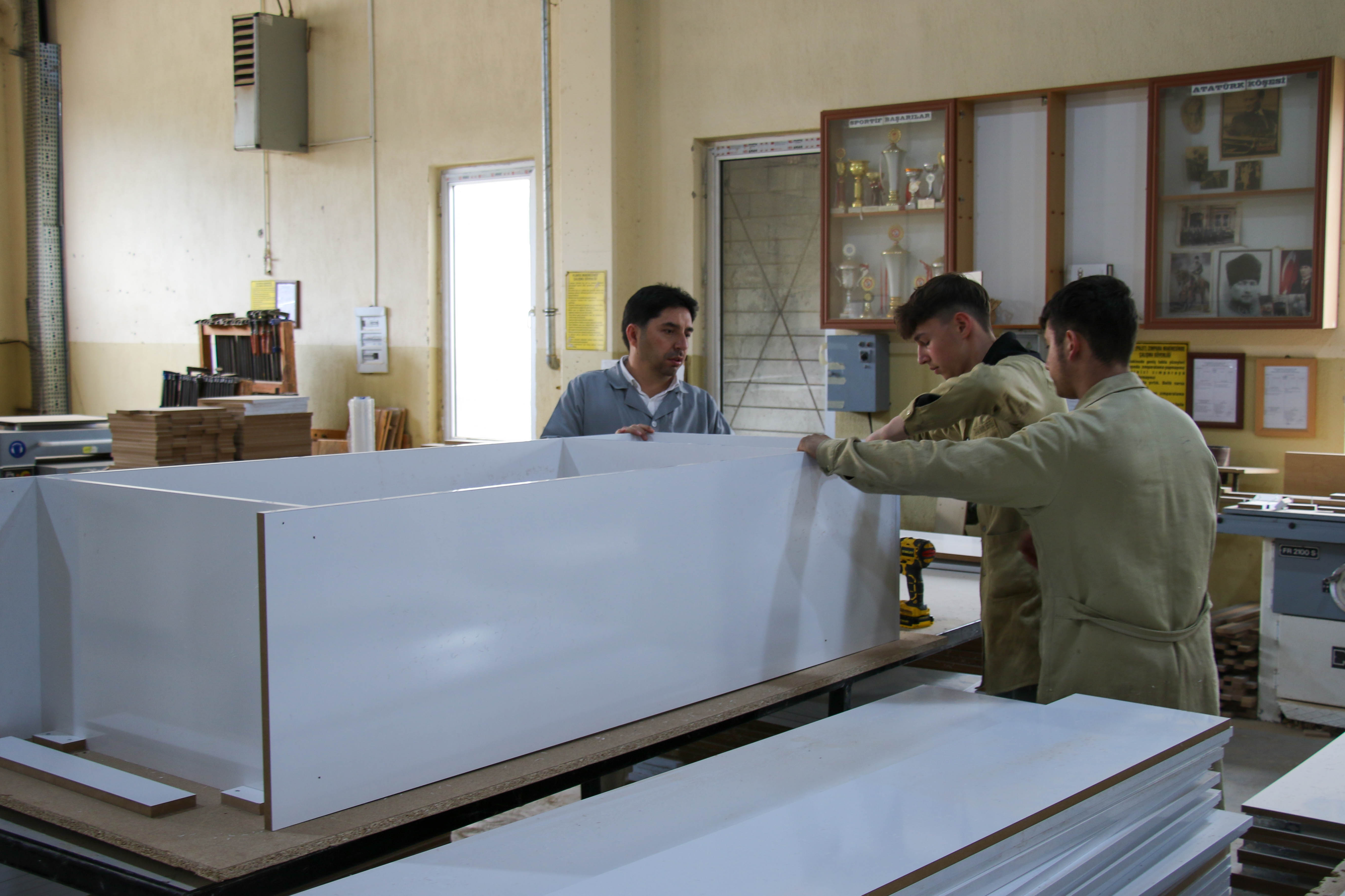 TOBB Mesleki ve Teknik Anadolu Lisesi Mobilya ve İç Mekan Tasarımı Alanı öğrencilerinin atölye çalışmasıyla yatak, baza, komodin, çalışma masası, bilgisayar masası, sandalye, dolap ve kütüphane üretimine başlandı.