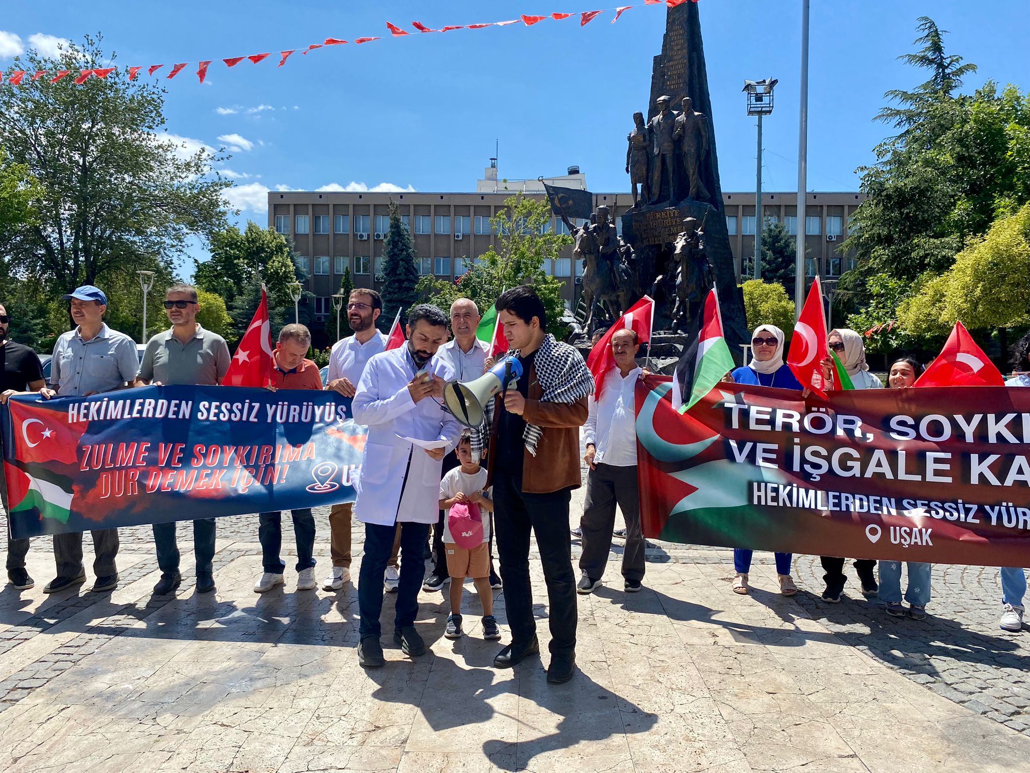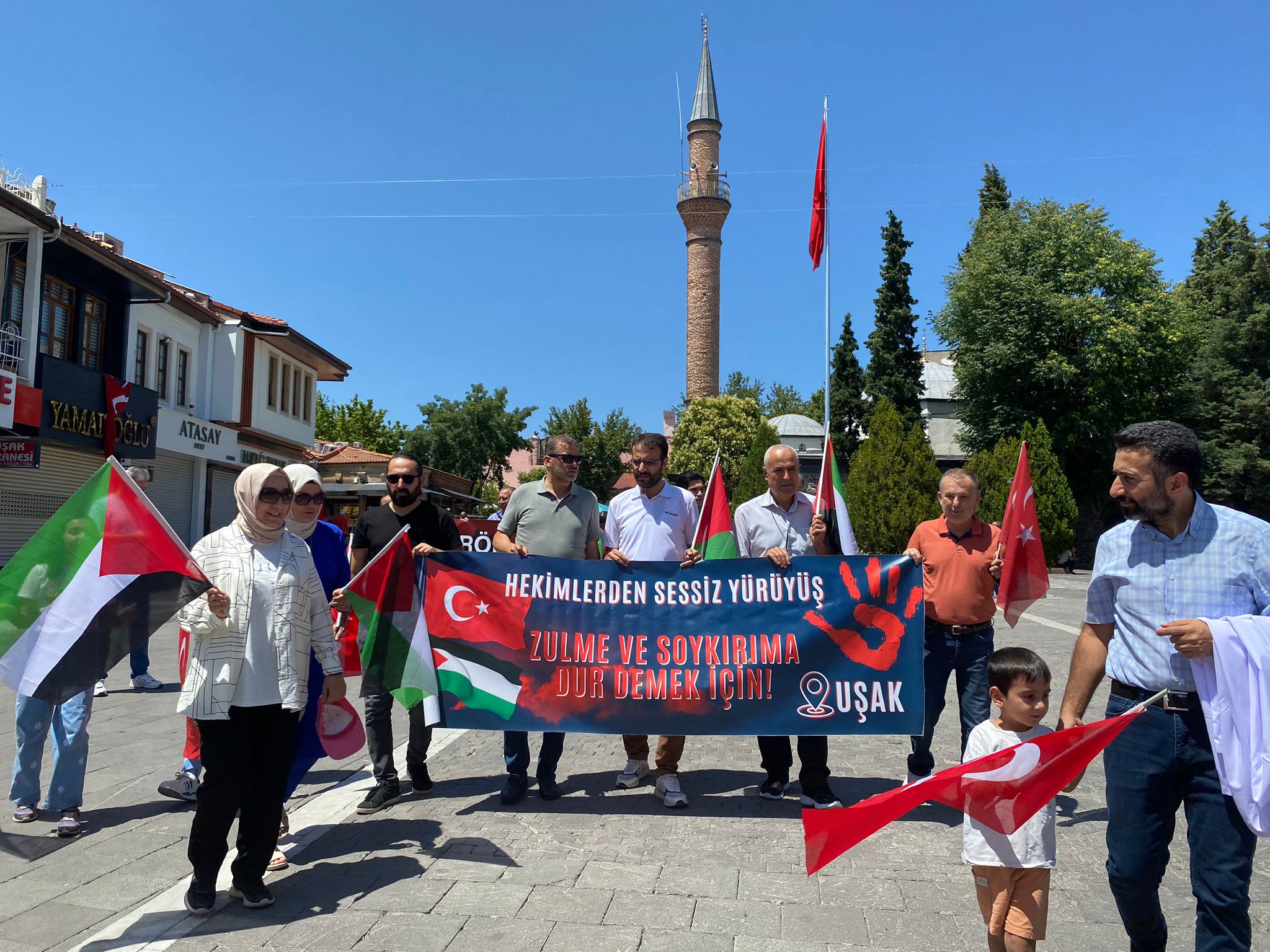 Uşak'ta, hekimler ve sağlık çalışanları, teröre, soykırıma ve işgale karşı sessiz yürüyüş düzenledi. Yürüyüşün sonunda yapılan basın açıklamasında, Gazze halkına ve orada zorlu şartlar altında çalışan sağlık çalışanlarına destek mesajları iletildi. Yapılan basın açıklamasında;