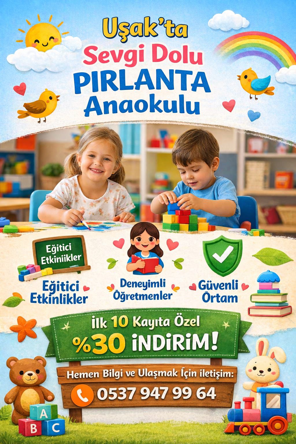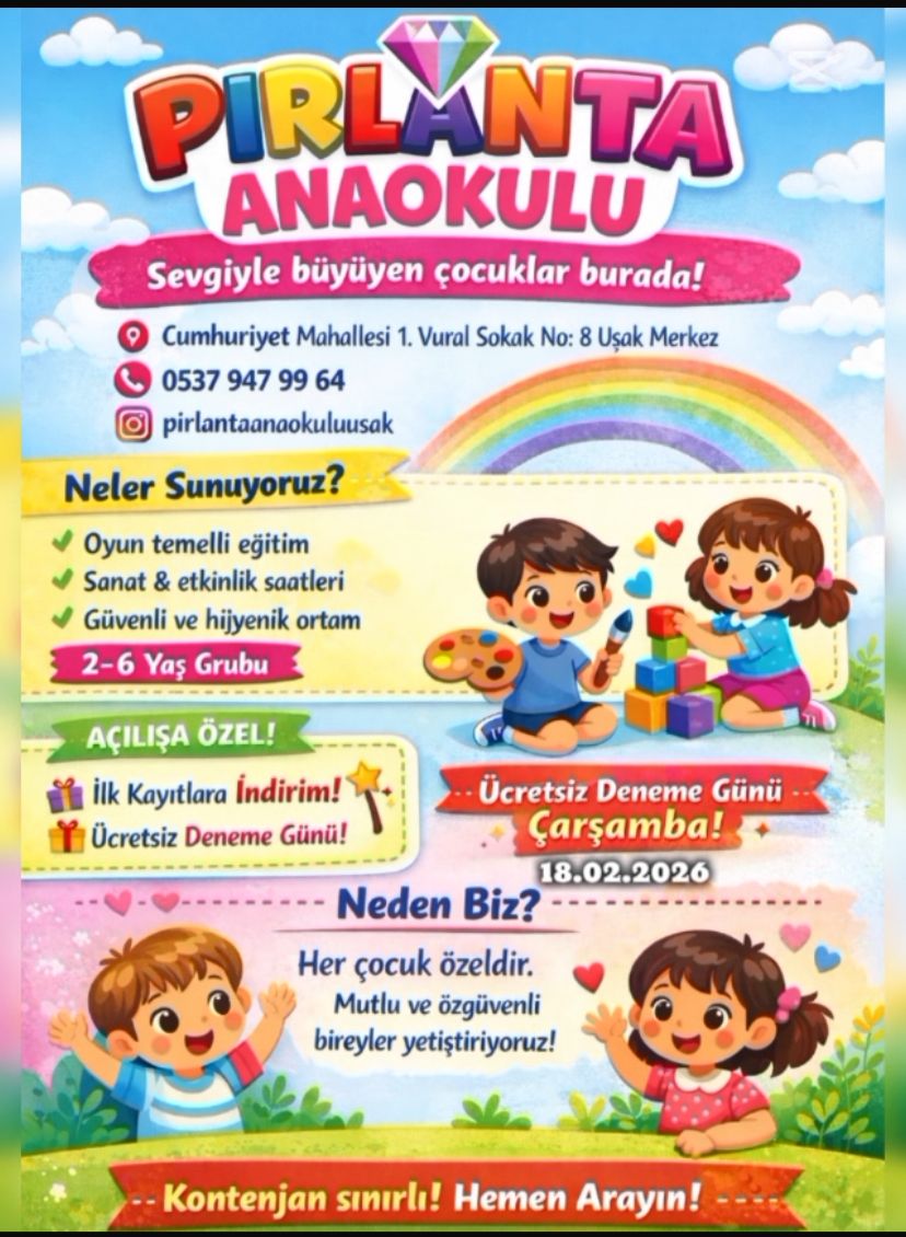 Uşak’ta okul öncesi eğitim alanında hizmet veren Pırlanta Anaokulu, 2026 eğitim dönemi öncesinde velilere özel kampanyalarla kapılarını açtı. Cumhuriyet Mahallesi 1. Vural Sokak No: 8 Uşak Merkez adresinde faaliyet gösteren kurum, 2-6 yaş grubu çocuklara yönelik oyun temelli eğitim modeliyle dikkat çekiyor.İlk 10 Kayıta %30 İndirimPırlanta Anaokulu yönetimi tarafından yapılan açıklamada, açılışa özel olarak ilk 10 kayıt için yüzde 30 indirim uygulanacağı belirtildi. Ayrıca velilere ve öğrencilere yönelik “Ücretsiz Deneme Günü” etkinliği düzenleneceği duyuruldu. Deneme günü 18 Şubat 2026 Çarşamba günü gerçekleştirilecek.Deneyimli Öğretmen KadrosuKurumda görev yapan öğretmenlerin alanında deneyimli olduğu vurgulanırken, çocukların özgüvenli, mutlu ve kendini ifade edebilen bireyler olarak yetiştirilmesinin amaçlandığı ifade edildi.Yetkililer, kontenjanın sınırlı olduğunu belirterek erken kayıt çağrısında bulundu.Detaylı bilgi ve kayıt için: 0537 947 99 64 numaralı telefon üzerinden iletişime geçilebileceği bildirildi.
