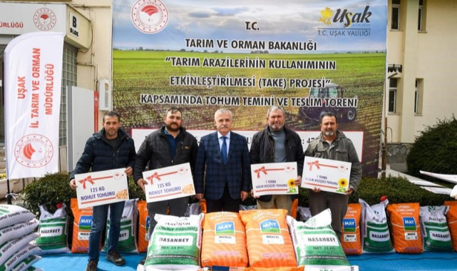 “Bu projelerden; 'Yağlık Ayçiçeğini Geliştirme Projesi' kapsamında Uşaklı üreticilerimize yüzde 50 Bakanlık yüzde 50 üretici katkılı olmak üzere 40 bin dekarlık alanda bin torba sertifikalı yağlık ayçiçeği tohumu dağıtılmış olup, 2021 yılında 5 bin 670 dekar olan ekim alanı 2023 yılında 40 bin dekara çıkarılmıştır. 'Nohut Üretimini Geliştirme Projesi' kapsamında yüzde 55 Bakanlık yüzde 45 üretici katkılı 4 bin dekarlık alanda 50 bin kg. sertifikalı nohut tohumu ve 'Keten Üretimini Geliştirme Projesi' kapsamında yüzde 75 Bakanlık yüzde 25 üretici katkılı 3 bin dekarlık alanda 12 bin kg. sertifikalı keten tohumunu çok kıymetli üreticilerimizle buluşturmanın mutluluğu içerisindeyiz.