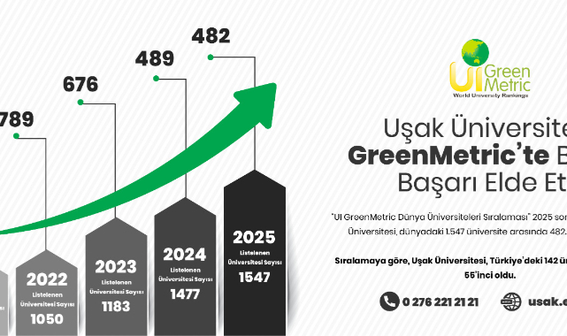 “UI GreenMetric Dünya Üniversiteleri Sıralama Sistemi” 2025 yılı sonuçlarına göre Uşak Üniversitesi, Dünyada listelenen 1.547 üniversite arasında 482’inci sıraya yükseldi. Dünya üniversitelerini; çevreye duyarlılık, enerji, atık, ulaşım yönetimi ve sürdürülebilirlik alanlarında değerlendiren “UI GreenMetric Dünya Üniversiteleri Sıralama Sistemi” 2025 yılı sonuçlarına göre Uşak Üniversitesi sıralamasını yine yükseltti.