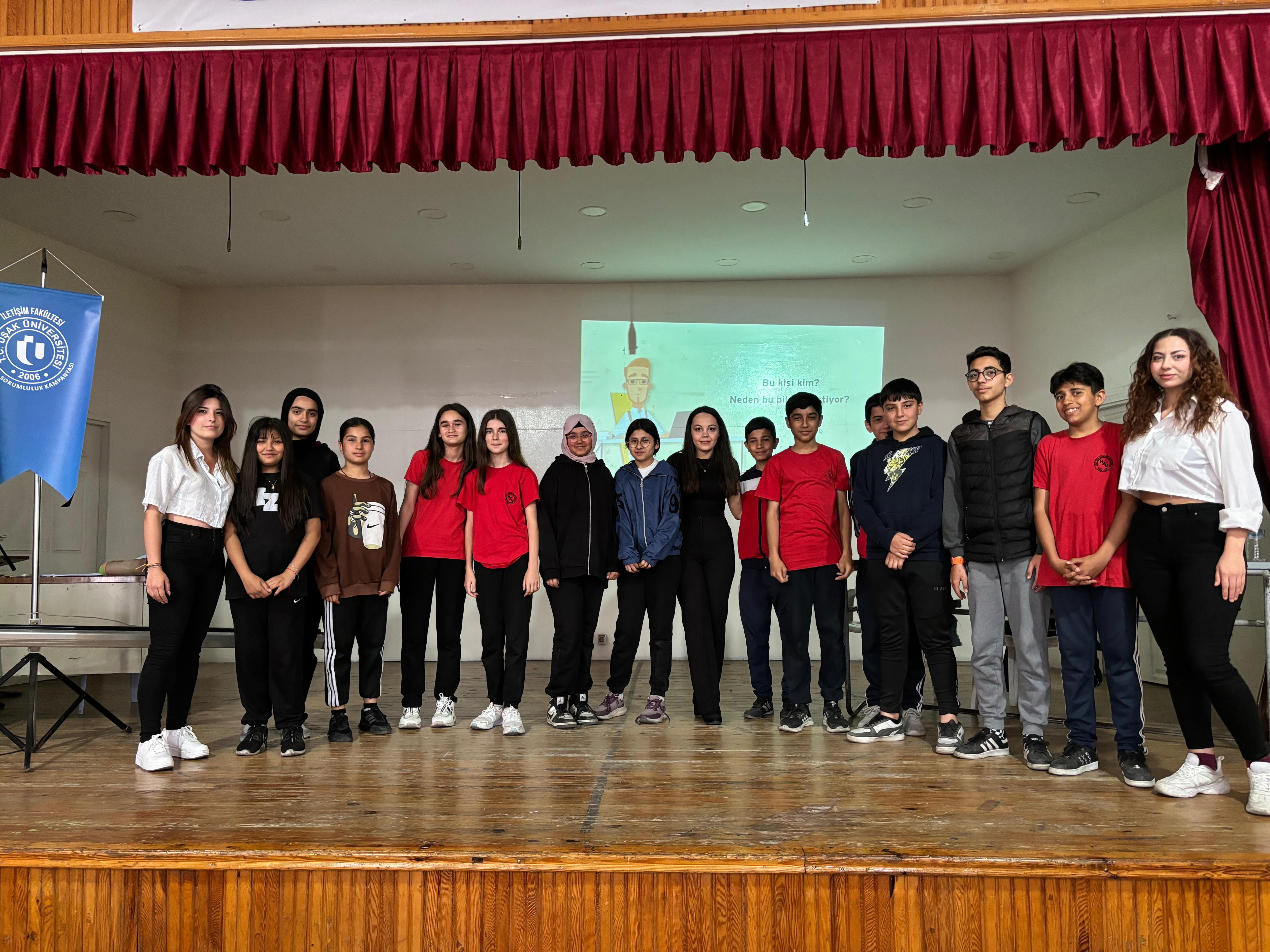 Sosyal Sorumluluk Kampanyaları dersi kapsamında Uşak Halit Ziya Uşaklıgil Ortaokulu’nda 7. sınıf öğrencilerine düzenlenen drama gösterisi ardından öğrencilerle etkileşim sağlayarak hikaye tamamlama etkinliği gerçekleştirdiler. Bu etkinlik, öğrencilerin siber zorbalıkla mücadelede farkındalık oluşturmasına ve dijital dünyada karşılaşabilecekleri tehlikelere karşı bilinçlenmelerine olanak sağladı.