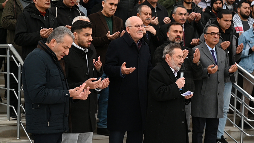 Uşak Üniversitesi Rektörü Prof. Dr. Ekrem Savaş, Rektör Yardımcıları Prof. Dr. Kenan Taş ile Prof. Dr. Lütfi Özav, akademik ve idari personel ile öğrencilerin katıldığı duada Filistin’de yaşanan vahşetin bir an önce durması ve savaşın bitmesi dilendi.