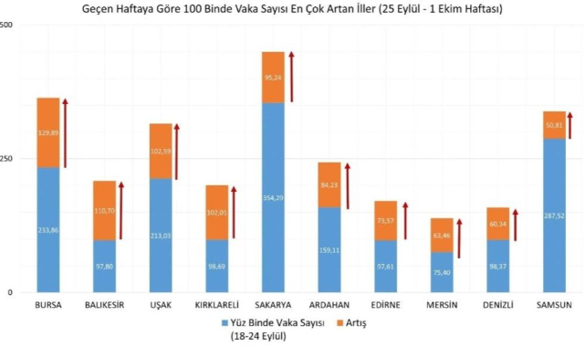 Bakan Koca, yaptığı açıklamada; "25 Eylül-1 Ekim arasında vaka yoğunluğu bir önceki haftaya göre en çok artan 10 ilimiz: Bursa, Balıkesir, Uşak, Kırklareli, Sakarya, Ardahan, Edirne, Mersin, Denizli, Samsun. Bu illerden birindeyseniz şimdi daha da dikkatli olmalısınız" dedi.