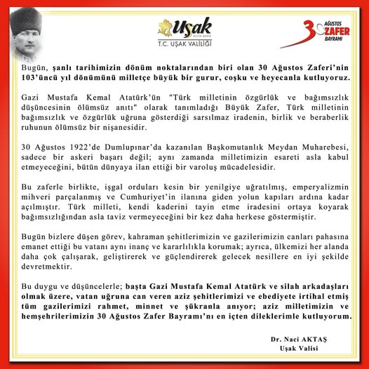 Genel Yayınlanma: 29 Ağustos 2025 - 15:34 Güncelleme: 29 Ağustos 2025 - 15:39 Uşak Valisi Dr. Naci Aktaş Uşak Halkının 30 Ağustos Zafer Bayramı'nı yayınladığı mesajla kutladı Uşak Valisi Dr. Naci Aktaş Uşak Halkının 30 Ağustos Zafer Bayramı'nı yayınladığı mesajla kutladı Genel 29 Ağustos 2025 - 15:34 Güncelleme: 29 Ağustos 2025 - 15:39 Yorumlar Yazdır A Büyüt A Küçült Yorumlar YORUMLAR adlı kullanıcıya cevap x Gönder ANASAYFAYA DÖNMEK İÇİN TIKLAYINIZ İlginizi Çekebilir Eşme Belediye Başkan Vekilliğine Zeki Işık seçildi AK Parti Kula'da Mahalle Başkanları Toplantısı gerçekleştirildi Salihli'de gönüllülere orman yangını eğitimi Uşak'ta Okullarda Şiddet Tartışması: Vatandaşlar ve Eğitimciler Sebepleri Konuştu Son Haberler Eşme Belediye Başkan Vekilliğine Zeki Işık seçildi UŞAK’TA GES PROJESİ İPTAL EDİLDİ Selendi AK Parti'de mahalle başkanları toplandı AK Parti Kula'da Mahalle Başkanları Toplantısı gerçekleştirildi Uşak'ta kavga ihbarına giden polislere ateş açan şüpheli tutuklandı Çok Okunan Haberler Uşak Belediyesine yönelik operasyonda gözaltına alınan şüpheliler... Uşak Belediyesi’ne yönelik rüşvet soruşturmasında gözaltına... Uşak Sivaslı’da Anlamlı Lansman: "Deprem Solaraları İçin" Kalemini... SARAYALTI MAHALLESİ MUHTARI CEMİL CEVHER: “3 DÖNEMDİR AYNI TALEPLERİ... Uşak'ta Cirit Kazası: Beyin Ölümü Gerçekleşen Genç Sporcu 6 Kişiye... Uşak’ta Eğitim Yöneticileri Yeni Dönem İçin Toplandı Uşak’ta Eğitim Yöneticileri Yeni Dönem İçin Toplandı