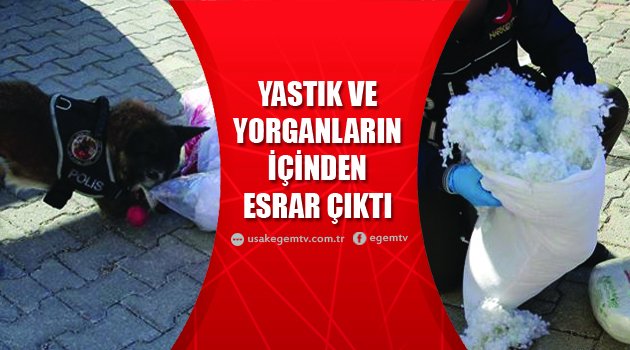 Uşak İl Emniyet Müdürlüğü Narkotik Suçlarla Mücadele Şube Müdürlüğünce Terör örgütünün önemli finans kaynaklarından olan uyuşturucu madde ticareti-sevkıyatının önlenmesi ve sokak satıcılarına ulaşmadan engellenmesine yönelik yapılan operasyonlar sonucunda; Afyonkarahisar ilinde takibe alınarak, Uşak girişinde oluşturulan uygulama noktasında durdurulan 64*** plakalı araç içerisinde, detektör köpeği ile yapılan aramada çeyiz eşyalarının (yastık, uyku seti) ve valizlerin içerisine gizlenmiş şekilde toplam 10,350 kg esrar maddesi ele geçirildiOlayla ilgili 3 şahıs yakalanarak, Uyuşturucu veya Uyarıcı Madde İmal ve Ticareti Yapmak suçundan gözaltına alınıp, adli mercilere sevk edildi