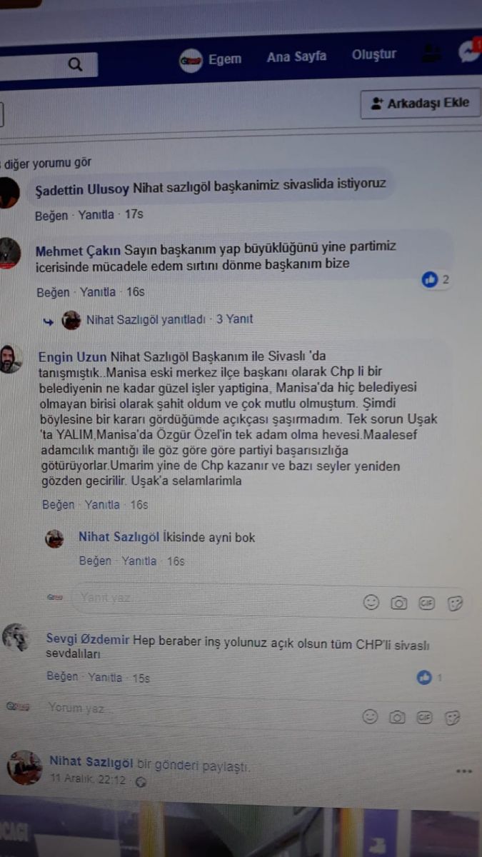 CHP’den yeniden Belediye Başkan Adayı gösterilmeyen Mevcut Belediye Başkanı Nihat Sazlıgöl,bunun sorumlusu olarak ,Özkan Yalım’ı sorumlu tutmuş ,hemşerisi ,akrabası veya hısımı olan Yalım’a ateş püskürmüş ve büyük bir şuur patlaması ile CHP’nin bu iki önemli isminin ,