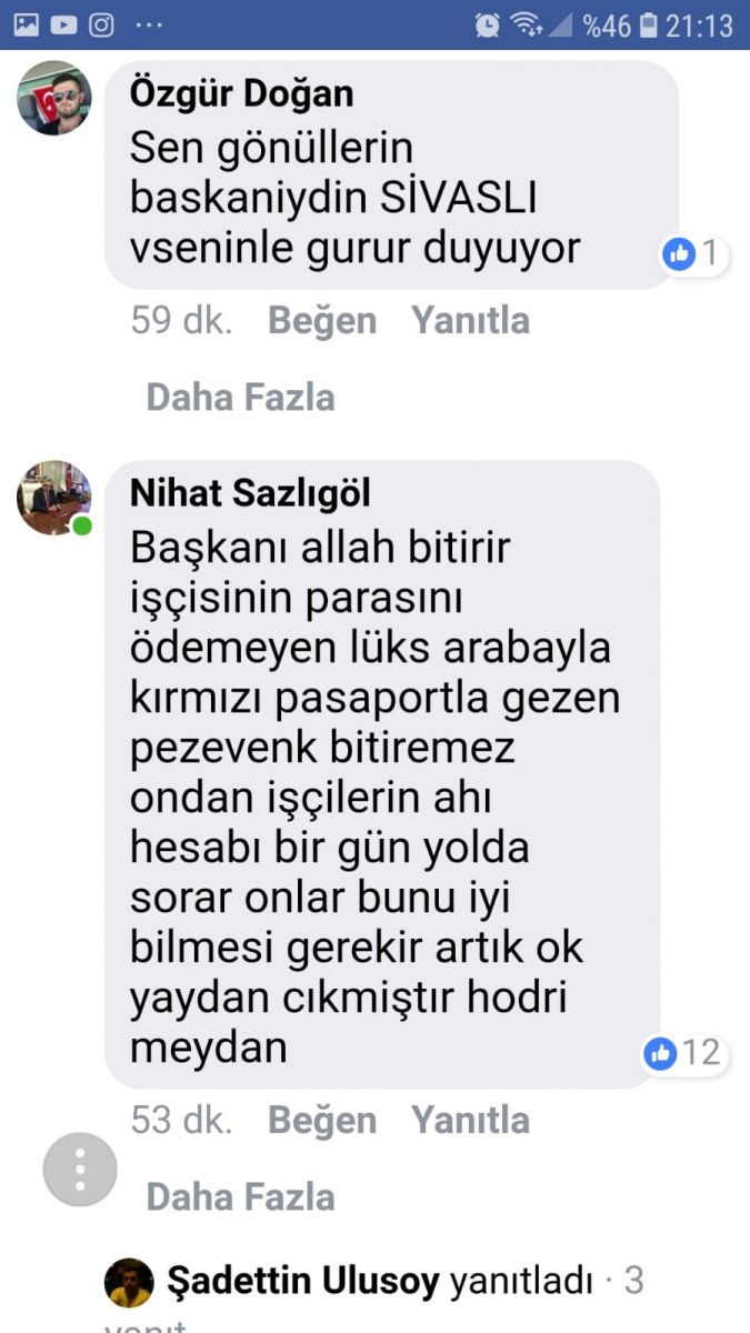 “BAŞKANI ALLAH BİTİRİR, İŞÇİSİNİN PARASINI ÖDEMEYEN, LÜKS ARABAYLA KIRMIZI PASAPORTLA GEZEN, PEZEVENK BİTİREMEZ.ONDAN İŞÇİLERİN AHI, HESABI BİR GÜN YOLDA SORAR,.BUNU İYİ BİLMESİ GEREKİR.ARTIK OK YAYDAN ÇIKMIŞTIR.HODRİ MEYDAN “ diyen.