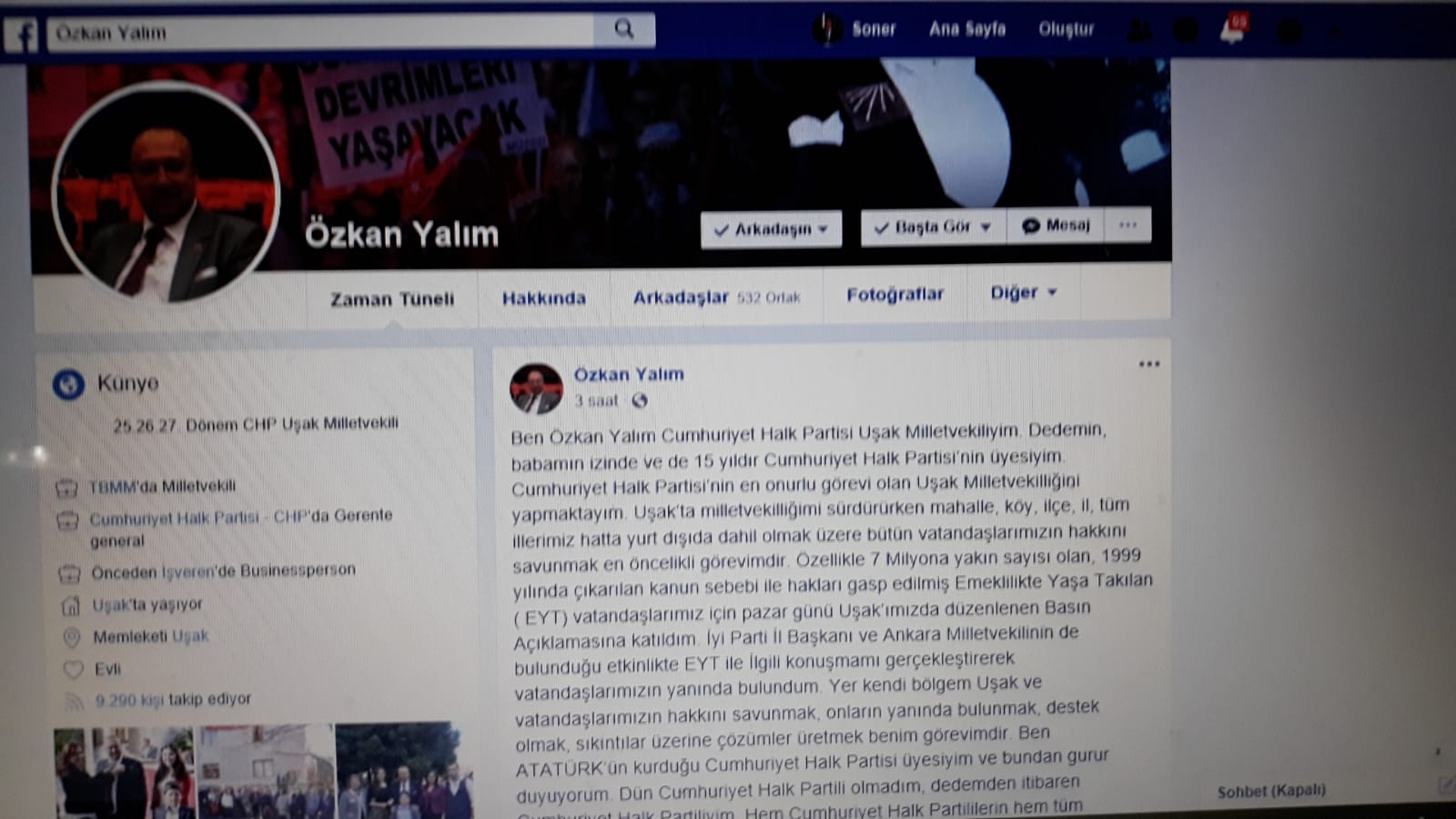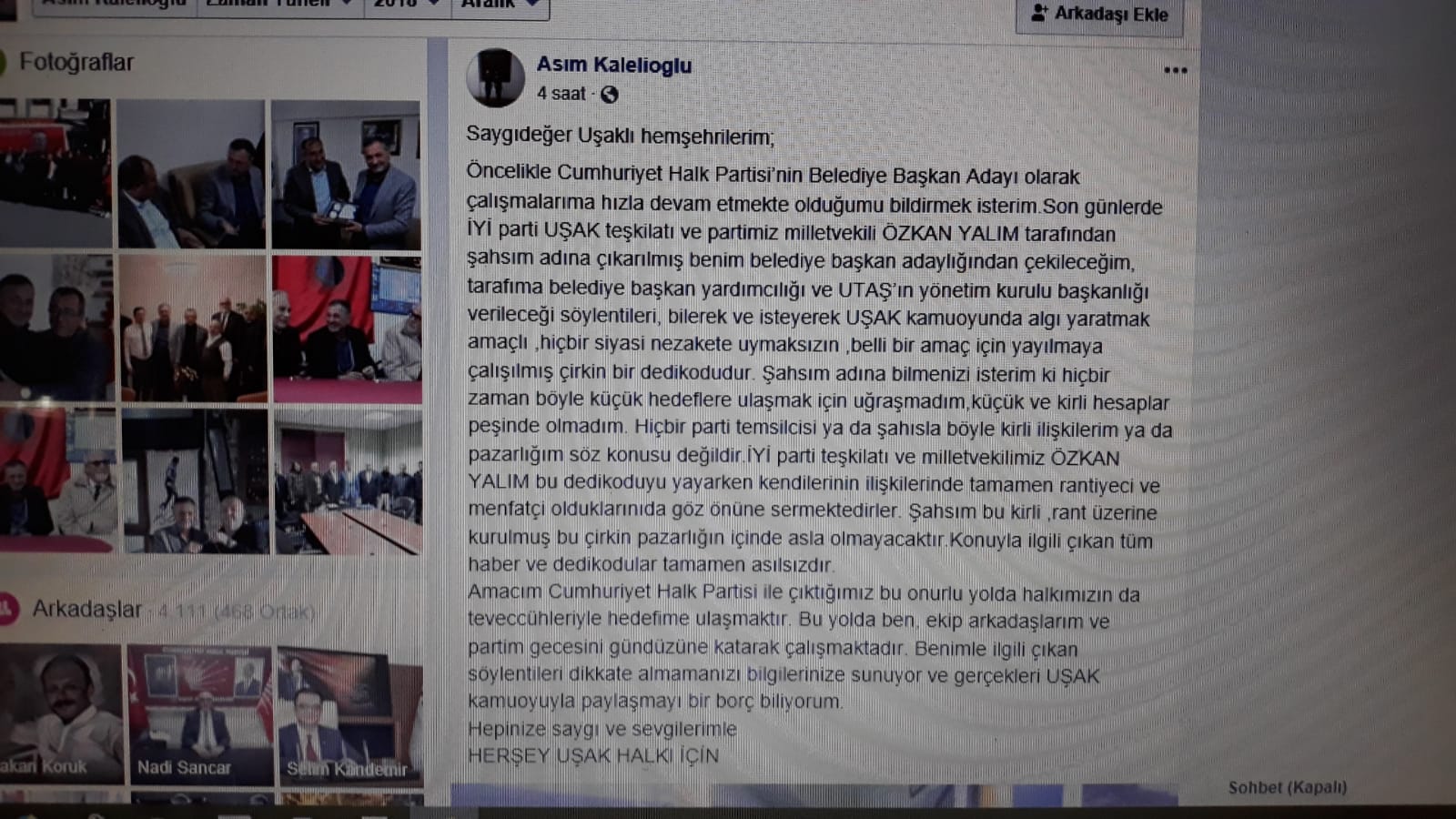 Son günler de Uşak’ta hedef noktası olan CHP Milletvekili Özkan Yalım, son darbeyide CHP Uşak Belediye Başkan Adayı Asım Kalelioğlu’ndan yine Kalelioğlu nun,kendi sosyal medya hesabından paylaştığı açıklama ile yemiştir.